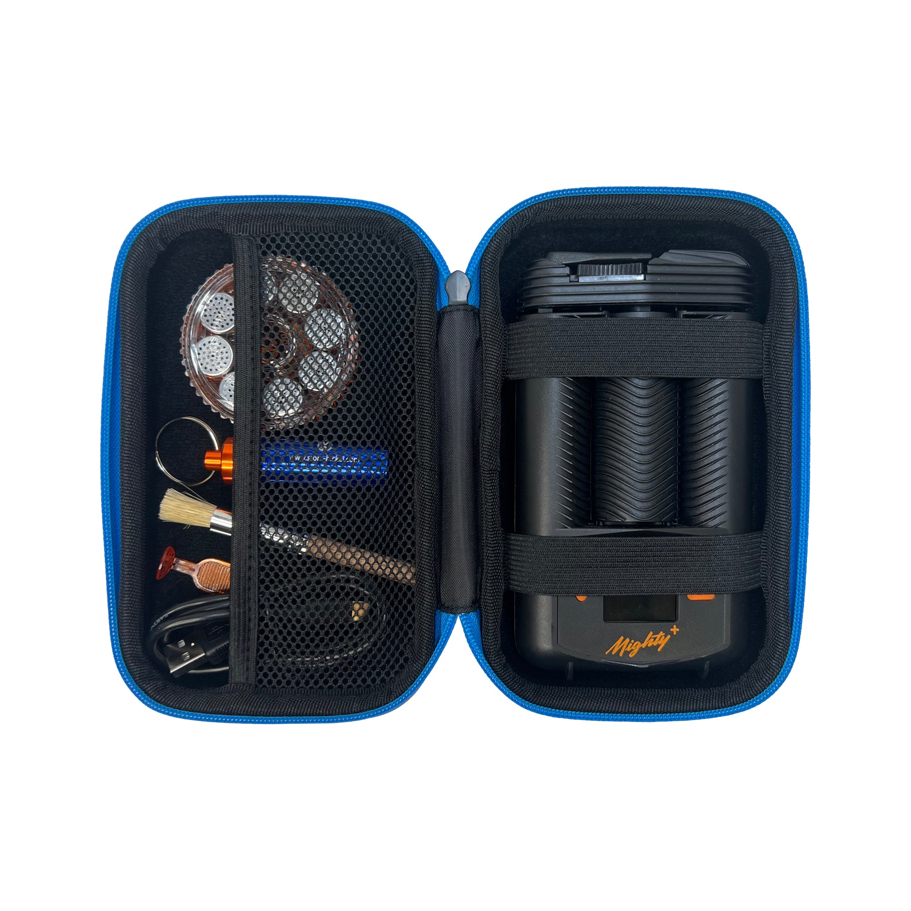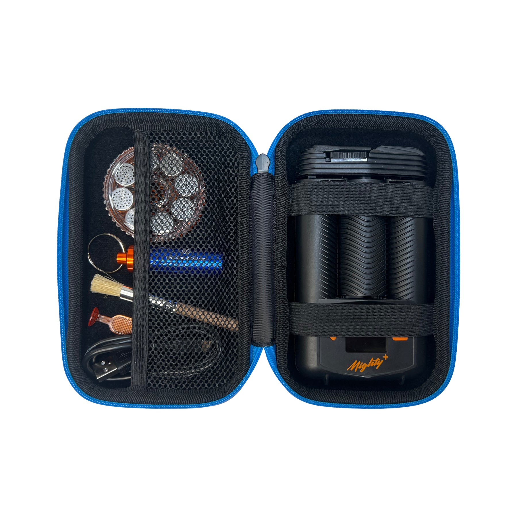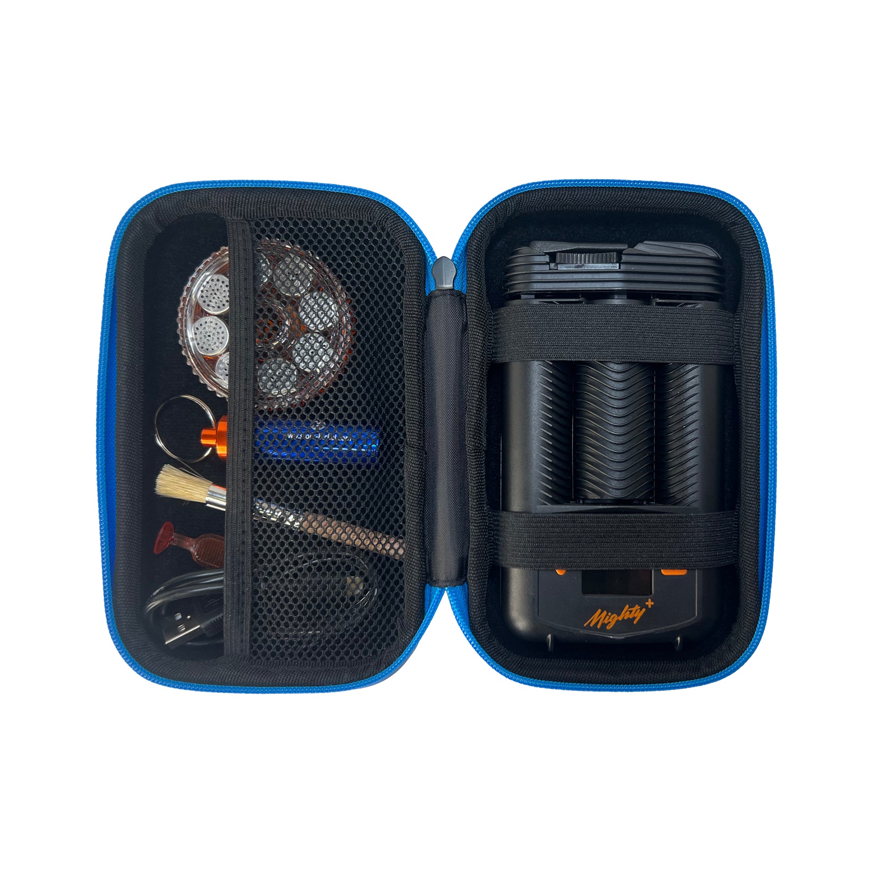 The opposite side features two strong elastic straps that securely hold your Mighty+ MEDIC vaporizer, preventing movement and protecting it from knocks and scratches.